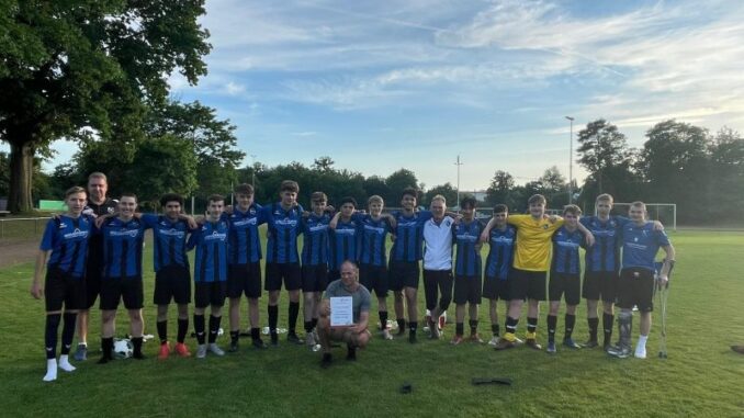 Im entscheidenden Spiel Erster gegen Zweiter starteten unsere SVLer sehr nervös. Der FSSV war klar besser und hatte einige Torchancen. Keeper Niclas Huck parierte aber immer prächtig. Gegen das 1-0 konnte er aber nichts machen. Danach fingen sich die blau schwarzen aber und kamen besser ins Spiel. Mitte der zweiten Hälfte verschlief man aber in der Abwehr einen langen Ball zum 2-0. Lars Becker schaffte dann kurz vor Schluss den Anschluss per Elfmeter. Danach war aber keine Zeit mehr auszugleichen. Zuerst große Enttäuschung in den Gesichtern. Als man dann trotzdem vom Verband zum gemeinsamen Meister mit dem FSSV gekürt wurde( das Torverhältnis zählt nicht in der Jugend) konnte man doch lachen in den Gesichtern sehen und feiern. Glückwunsch zum Meistertitel SVL A Jugend