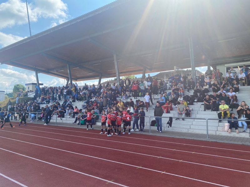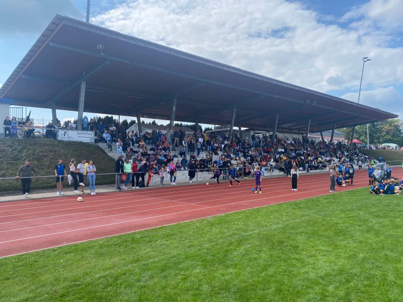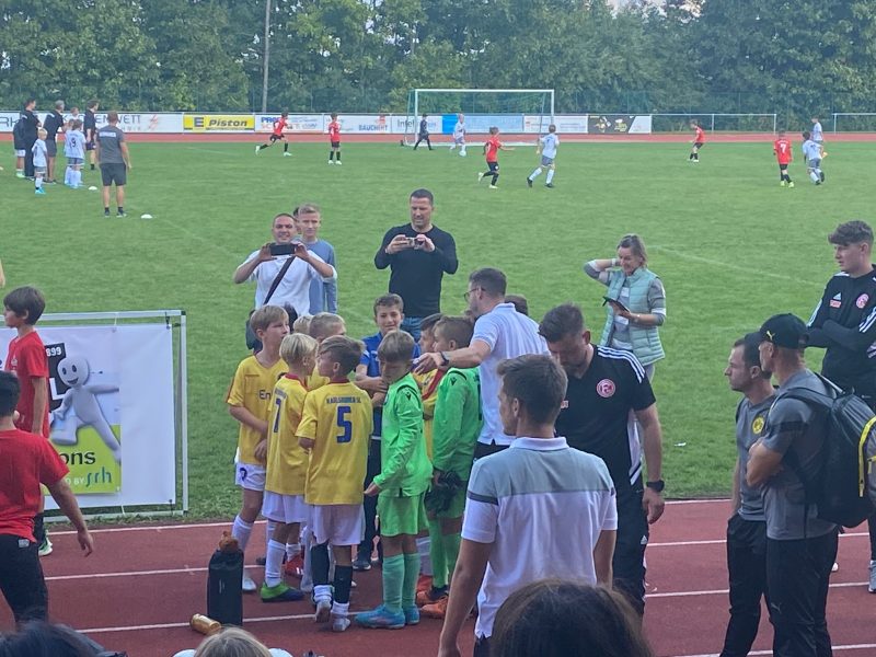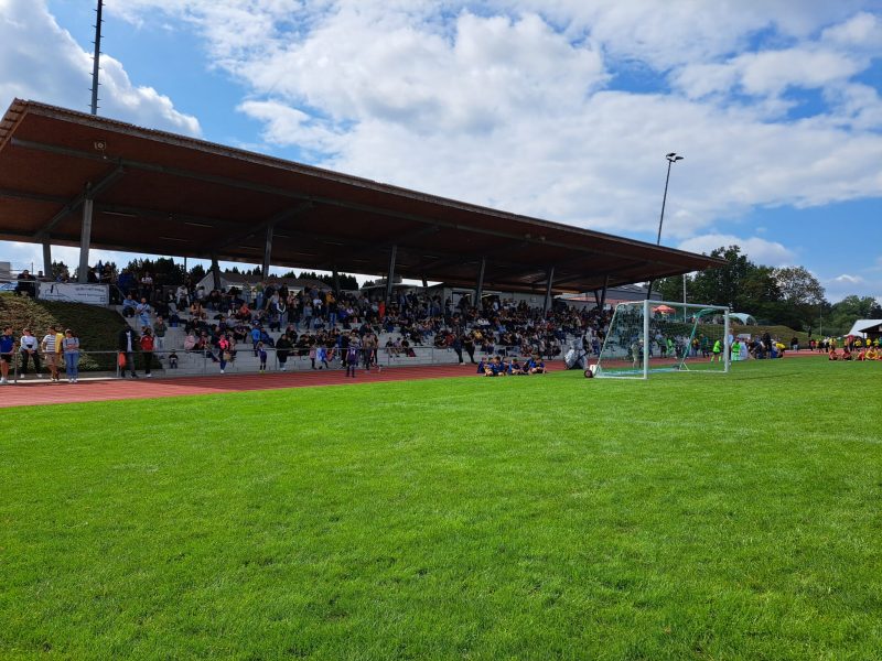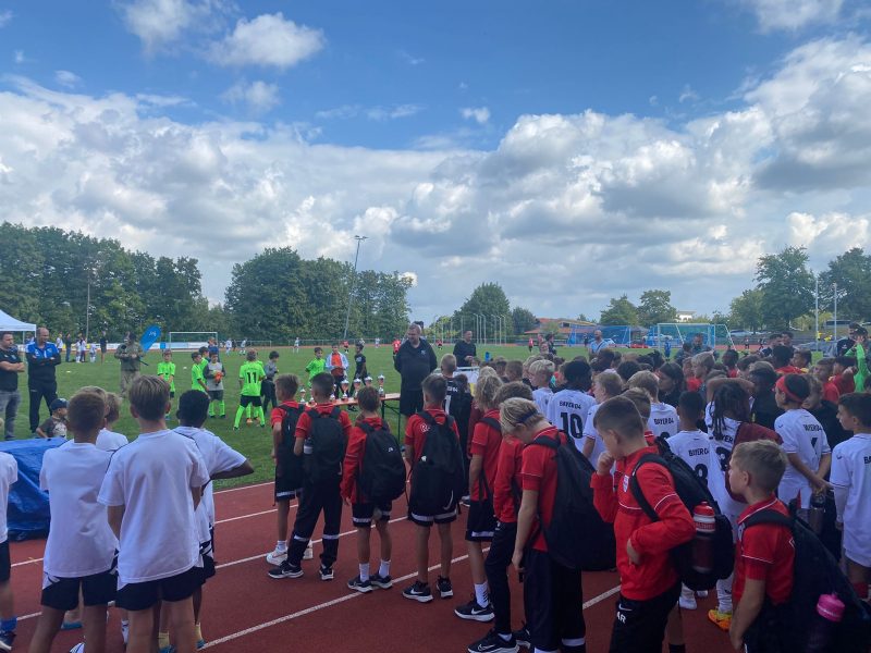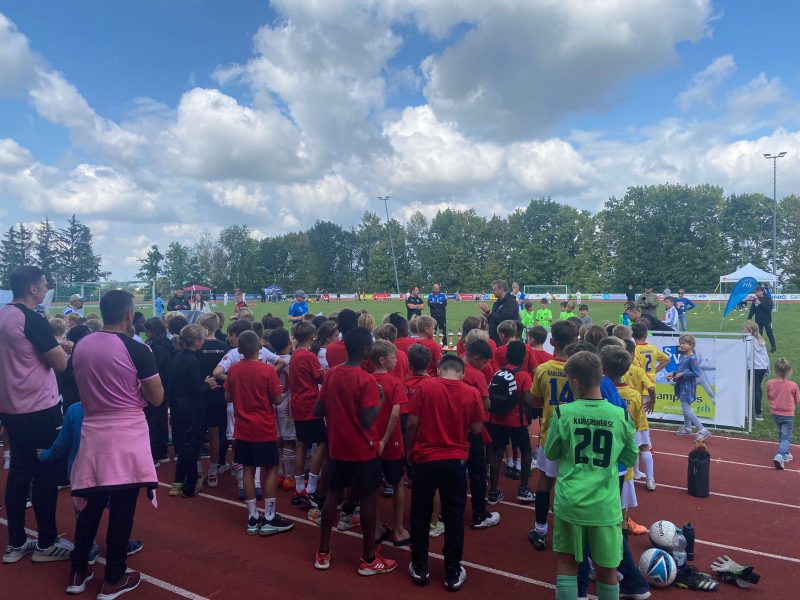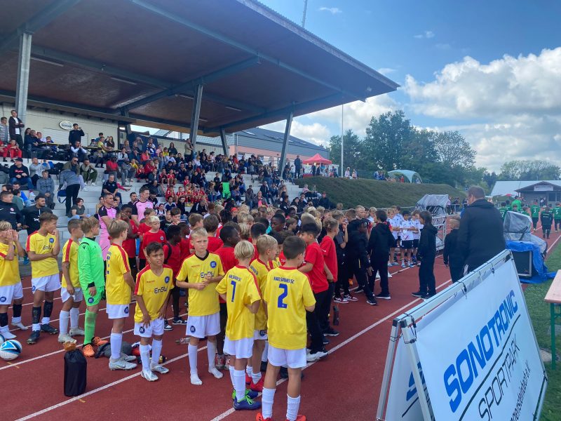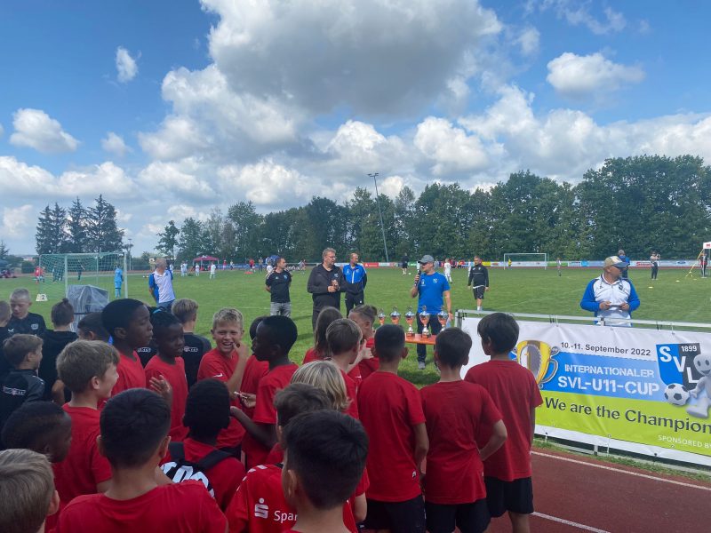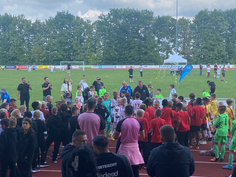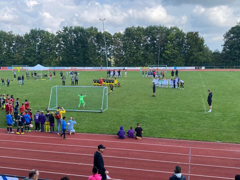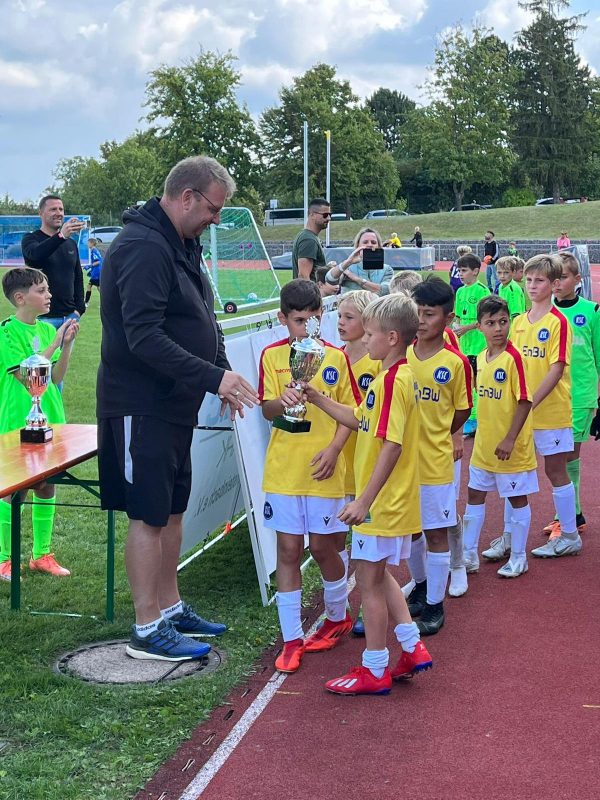 Bilder 2022 Siegerehrung Fortuna Düsseldorf Siegerbild Fortuna Düsseldorf Zweitplatzierter KSC Finalspielbild Siegerehrung vor Tribüne Die Pokale der BVB spielt Spannende Spiele satt